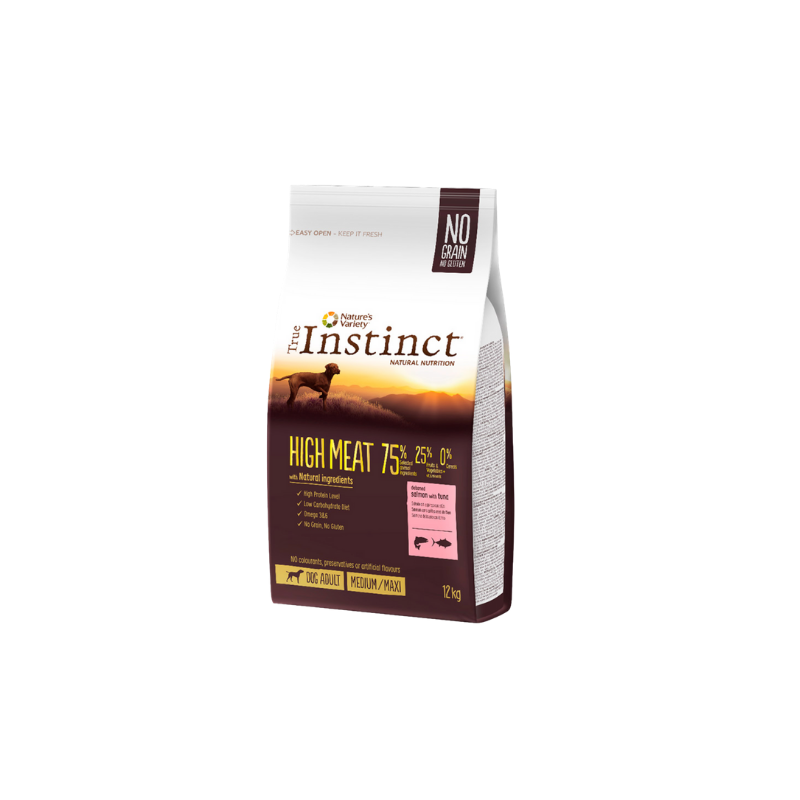 Receta con un alto contenido en carne y pescado, sin cereales y bajo en carbohidratos (max. 20% ELN) para satisfacer la nutrición instintiva del perro.