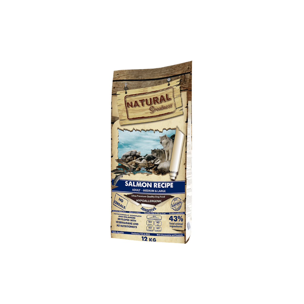 Salmón deshidratado (20%), Patata, Salmón fresco (10%), Proteína de patata, Aceite de Pollo (9,5%), Levadura, Pulpa de remolacha, Hidrolizado de salmón (2%), Aceite de salmón (1,5%), Semilla de linaza, Sustancias Minerales, Glucosamina, Achicoria, Mananooligosacáridos, Extracto de cítricos (Pomelo, Naranja, Mandarina y Bergamota), Condroitina y Yuca.